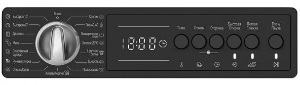 Достаточно простыми, но гораздо более информативными являются цифровые дисплеи, которые могут отображать числовую информацию и ограниченное количество символов. На таком дисплее, например, может отобразиться номер программы, скорость отжима, блокировка люка, отсрочка старта, температура воды, время, оставшееся до конца работы, символические обозначения действующих функций и прочая достаточно простая информация. Изображение может быть разного цвета — белого, зеленого или голубого, в любом оно будет хорошо заметно даже при отключенном освещении.