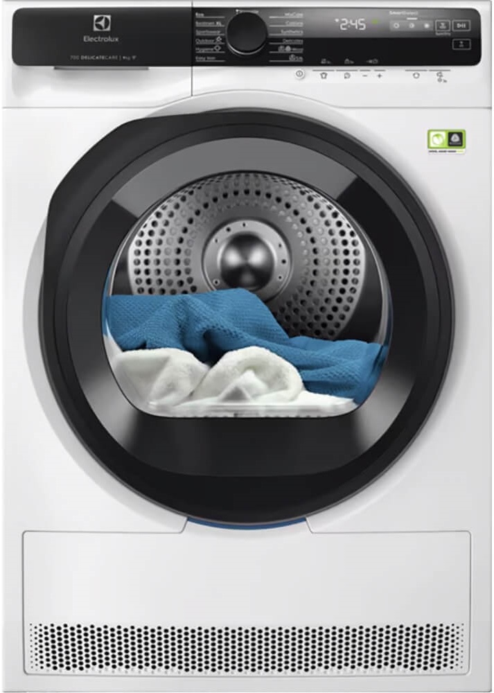 Тип сушки белья в данной модели — конденсационная с тепловым насосом. Это самый распространенный вариант, так как его просто реализовать и в работе он надежен, безопасен и удобен.
