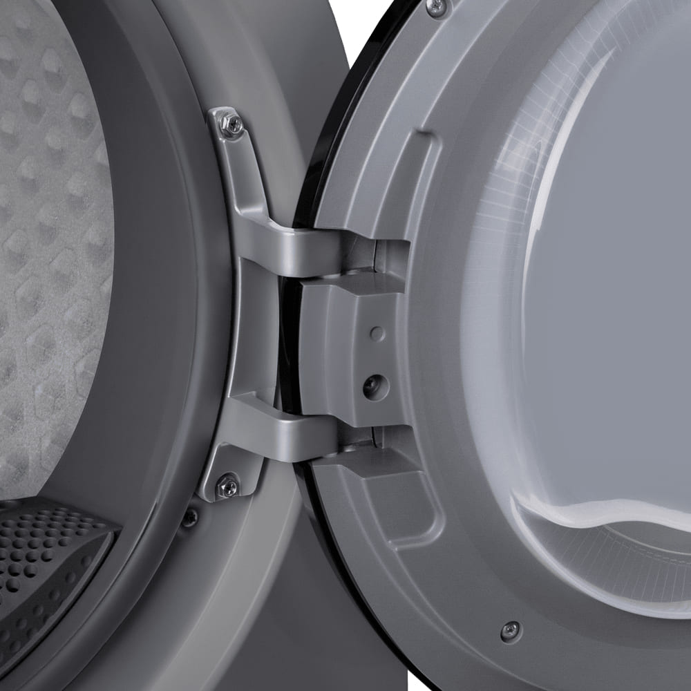 В барабан единовременно можно загрузить 8 кг. Подсветка — не только красивая, но и функциональная деталь, так как дает хороший обзор, как проходит сушка. Цвет корпуса — нержавеющая сталь. Конструктивные решения, которые выделяют эту модель: регулируемые ножки.