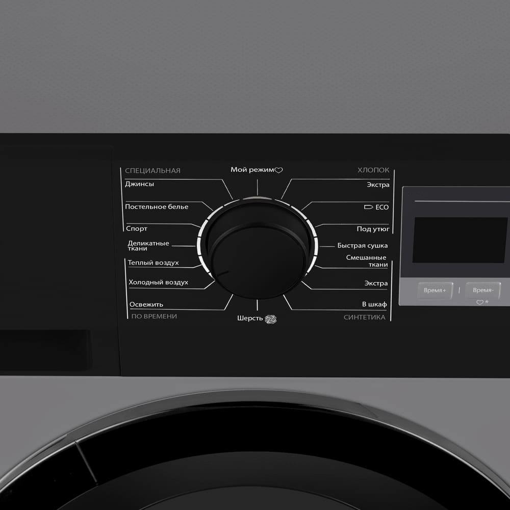 Элементы на панели управления сушильной машины служат для выбора программы сушки, для регулировки параметров работы, для задания дополнительных опций. Большинство сушильных маши оборудовано поворотными переключателями: с их помощью можно легко выбирать программу сушки — по остаточной влажности, по типу ткани, по виду изделий, по времени. Кнопки предназначаются для добавления к программе дополнительных опций: они могут быть как обычными, так сенсорными — в последнем случае все варианты выбора отображаются на дисплее, и возможности управления становятся более удобными и гибкими.