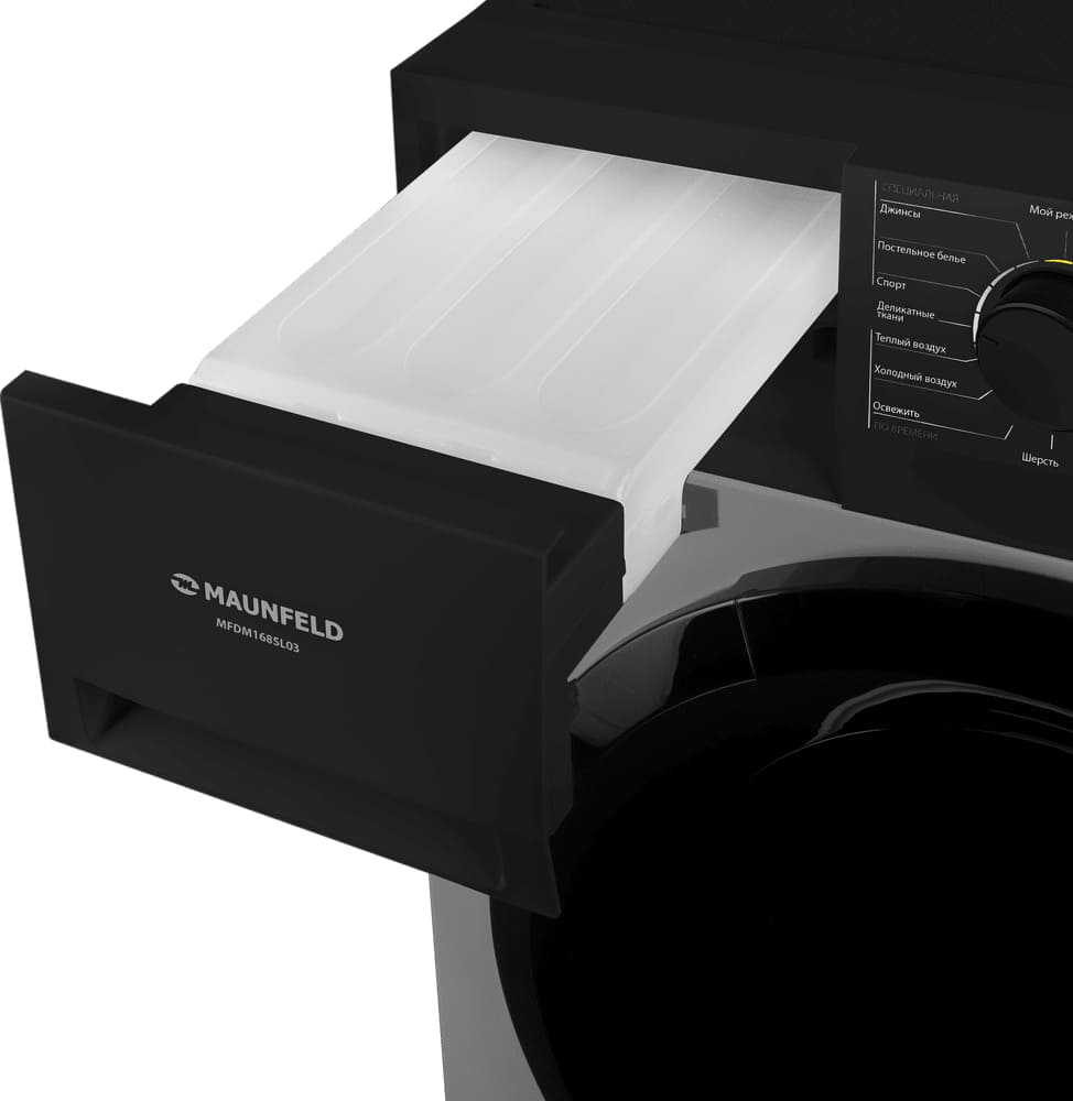Сушильная машина Maunfeld предназначена для домашнего использования, поэтому имеет стандартные габариты и большое разнообразие программ. Так как она устанавливается отдельно, нужно заранее найти достаточно места в помещении.