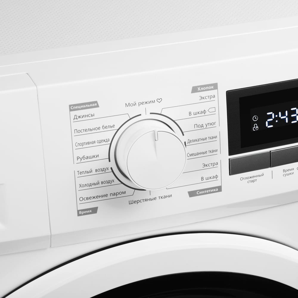 Возможность сохранить индивидуальные настройки облегчает и ускоряет запуск последующих циклов. Используйте также параметры остаточной влажности, в данной модели есть следующие: под утюг, в шкаф, экстрасушка — они позволяют точно определить, каким вы достанете белье из барабана.