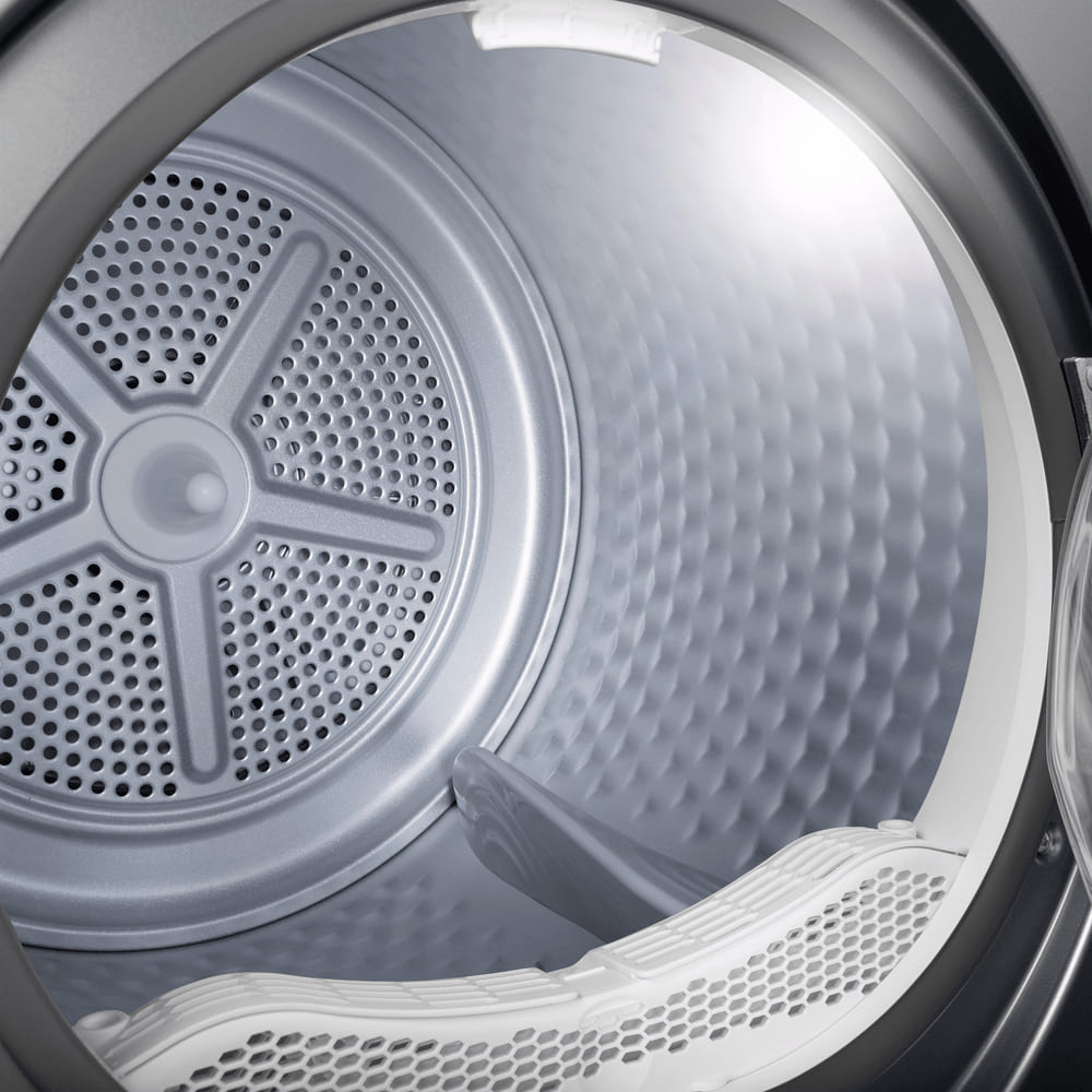 Стенки барабана покрыты «сотами» — небольшими выемками, благодаря которым образуется воздушная прослойка. Она амортизирует белье, увеличивает скорость сушки, предохраняет от складок.