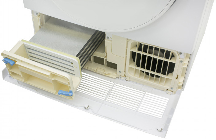 - Тепловой насос — поступающий внутрь воздух нагревается, что ускоряет и улучшает эффективность сушки. Затем он проходит через конденсационный отдел, отдает влагу и сухим повторно возвращается в барабан.