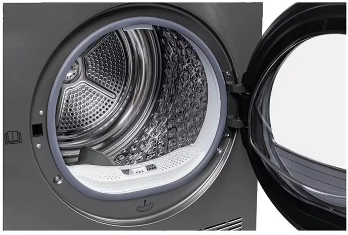 - Тепловой насос — поступающий внутрь воздух нагревается, что ускоряет и улучшает эффективность сушки. Затем он проходит через конденсационный отдел, отдает влагу и сухим повторно возвращается в барабан.
