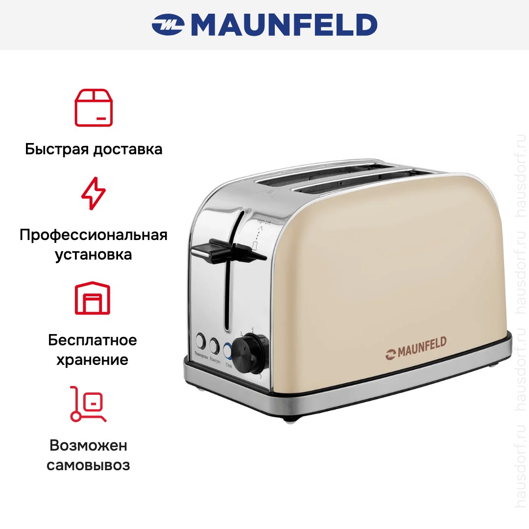 Стильный тостер Maunfeld имеет компактный корпус на устойчивых ножках, благодаря которым не пошатывается, даже если хлеб выпрыгивает вверх в конце приготовления. Основной материал, из которого изготовлен прибор, — нержавеющая сталь. Его главный оттенок — бежевый. Простое и понятное механическое управление позволяет быстро разобраться во всех функциях. Простое и понятное электронное управление позволяет быстро разобраться во всех функциях. На корпусе расположены кнопочные+поворотные переключатели для изменения настроек.