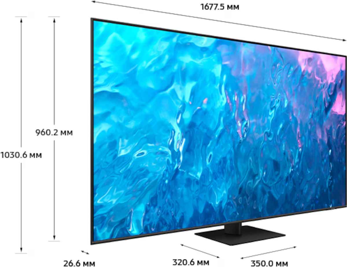 Тип экрана: QLED. Диагональ, ": 75. Цвет: темно-серый. Разрешение, px: 3840х2160. Формат: 16:9.