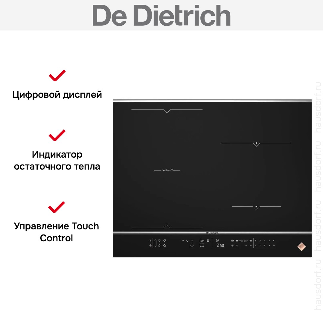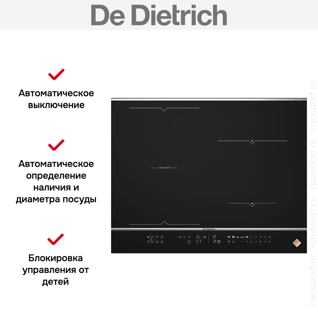 Модель Де Дитрих DPI7686XS входит в дизайн-линейку: horiZone Play. Цвет — черный. Материал самой поверхности: стеклокерамика. Управление этой моделью электронное. Для переключения уровней нагрева, выбора функций используются следующие переключатели: сенсорные/TouchControl. Продвинутая система контроля за прибором делают его современным и отвечающим на главные запросы покупателя.