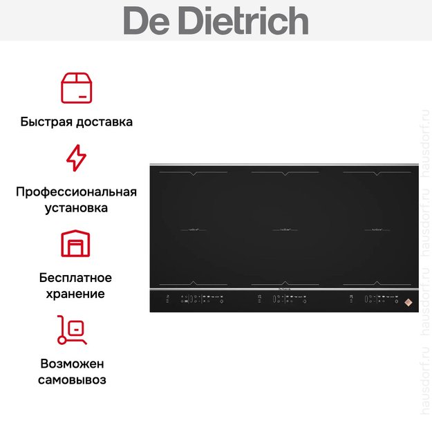 Эта высокотехнологичная модель производится во Франции — стране бренда. Официальная гарантия производителя выдается сроком на один год. Приобрести плиту De Dietrich DPI7969XS вы сможете на официальном сайте интернет-магазина «Хаусдорф». Обычная доставка и подключение производятся бесплатно. Предлагаем дополнительно заказать срочную доставку и установку, покупку в рассрочку, хранение товара на складе.