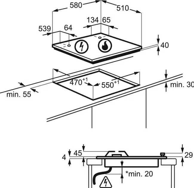 Электрические и индукционные варочные панели из стали, эмали и стеклокерамики имеют толщину от 4 до 5,5 cм, но выглядят более низкими, так как на них отсутствуют выступающие горелки. Как правило, подробные требования к толщине столешницы для установки приводятся в руководстве пользователя.