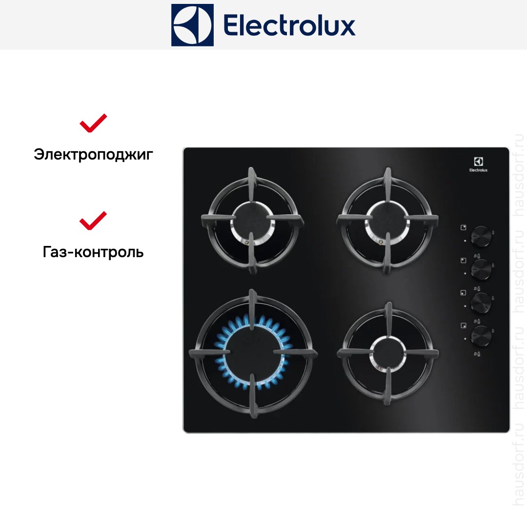 Модель Электролюкс KGG6407K входит в дизайн-линейку: Газ на стекле. Цвет — черный. Благодаря отсутствию рамки она отлично впишется в интерьер и не займет лишнее место на столешнице, которое можно использовать для работы. Открытый огонь не страшен ни вашей посуде, ни вам, так как горелки надежно закрыты решетками. Материал самой поверхности: закаленное стекло. Управление этой моделью механическое. Для переключения уровней нагрева, выбора функций используются следующие переключатели: поворотные. Простая система контроля за прибором делают его более универсальным, ведь разобраться сможет кто угодно.