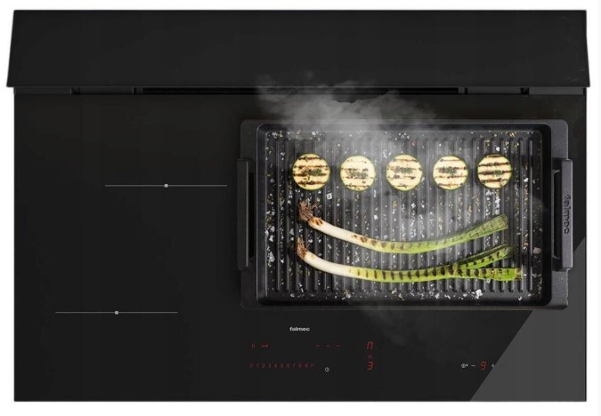 Вытяжка, встроенная в варочную панель — достаточно удобный вариант, позволяющий сэкономить место в кухне. Такая конструкция позволяет лучше улавливать испарения, не давая им распространяться по всему помещению, и способствует более качественной очистке воздуха. Большинство подобных моделей может работать только в режиме рециркуляции воздуха, с удалением капель жира, сажи, неприятных запахов при помощи системы фильтров. Работу в режиме отвода загрязненного воздуха через систему вентиляции организовать довольно сложно, поскольку вытяжка располагается низко над полом. Часто варочная панель находится на кухонном острове, что также мешает присоединению к вентиляции. Еще одна особенность подобных моделей состоит в том, что под варочной панелью нельзя разместить духовку или другую технику, так как место будет занято.