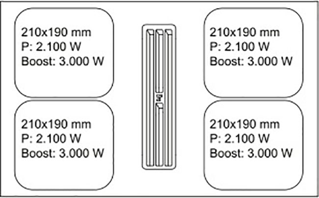 Варочная панель работает на индукционном нагреве — это значит, что повышается температура непосредственно посуды, в которой готовится блюдо. Таким образом промежуточная ступень с предварительным нагревом конфорки пропускается — сокращается время, повышается безопасность. Количество конфорок в этой модели: 4.