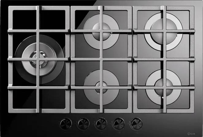 Выбор газовой варочной панели чаще всего обусловлен тем, что в частный дом или квартиру проведен именно газ в качестве обогрева. Работать с этой моделью довольно просто, так как мощность нагрева видна невооруженным взглядом — по силе огня в горелке. Количество конфорок в этой модели: 5. Горелки с двойной короной позволяют увеличивать мощность нагрева в зависимости от диаметра посуды.