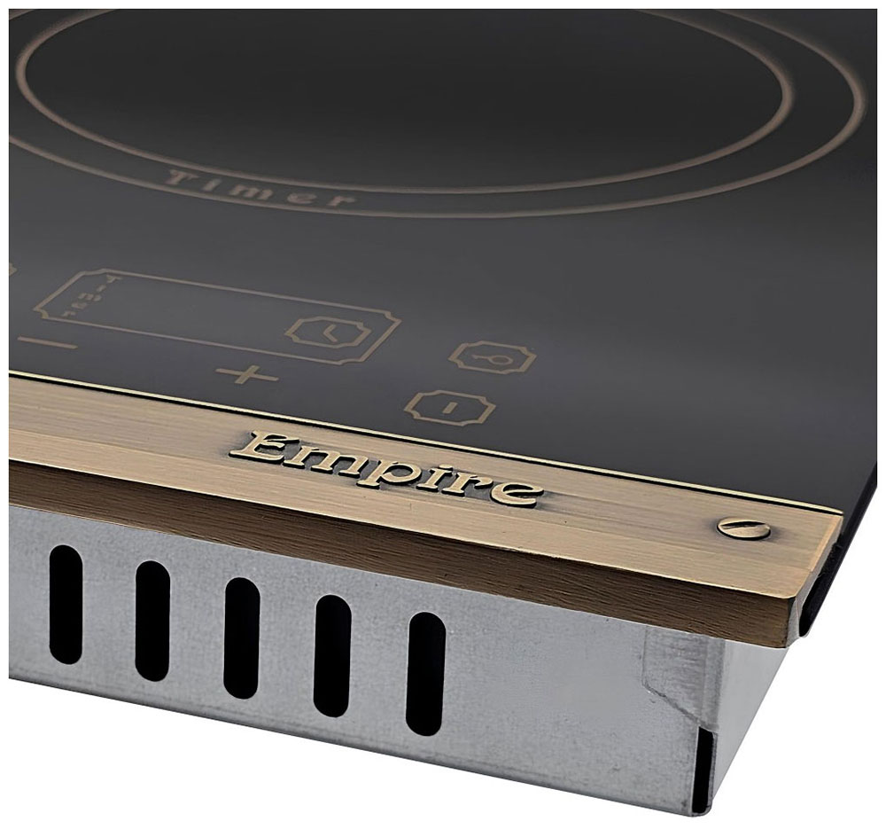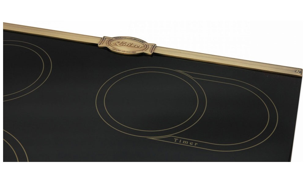 Варочная панель Kaiser KCT 6185 Em — элегантный прибор в стиле Empire, который гармонично сочетает черную стеклокерамику и бронзовую металлическую рамку. Внешний вид выполнен с акцентом на сдержанную роскошь, что делает изделие центральным элементом кухни и одновременно не перегружает интерьер. Высота всего 4,3 см придает поверхности легкость, а качественная обработка края обеспечивает аккуратный стык со столешницей. Материалы подобраны так, чтобы сохранить презентабельный вид при регулярной эксплуатации и упростить уход за плитой.