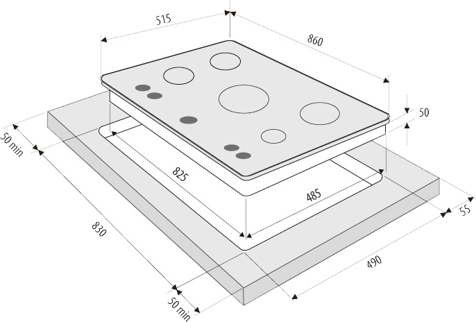 Габариты прибора составляют 6 см в высоту, 86 см в ширину и 51,5 см в глубину, что указывает на его принадлежность к широкому формату — идеально подходящему для просторных кухонь или кулинарных зон, где важна одновременная работа с несколькими блюдами. Для корректного встраивания требуется ниша шириной 83 см и глубиной 49 см, что обеспечивает надёжную фиксацию и достаточную вентиляцию. Ширина встраивания указана как 90 см, а глубина — 48,5 см, что учитывает особенности монтажа и совместимость с крупногабаритными кухонными модулями.