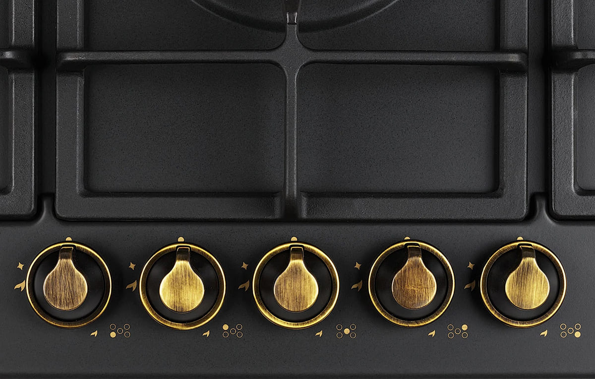 Для варочных панелей в стиле кантри, ампир или классическом характерны латунные ручки из сплава меди и цинка, которые смотрятся благородно и выигрышно. Реже производятся модели, имеющие золотистую или медную фурнитуру.