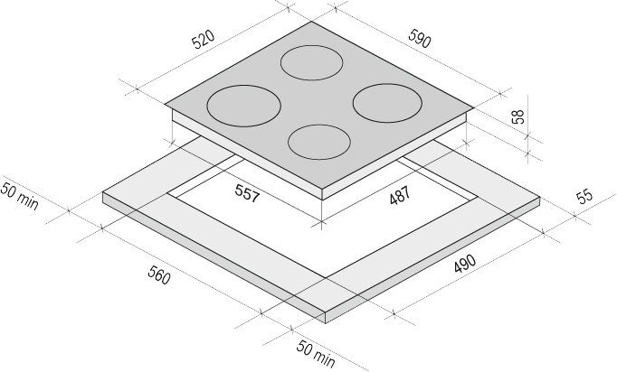 Отверстие в нише выполняют, исходя из размеров самой варочной панели — они должны соответствовать друг другу либо немного превышать размеры выреза. При выборе наиболее распространенной варочной панели с 4 конфорками в столешнице вырезается отверстие шириной 59 см и глубиной около 49-50 см. Толщина столешницы должна быть немного меньше, чем высота варочной панели, в противном случае панель придется заглубить, чтобы она не слишком выступала.