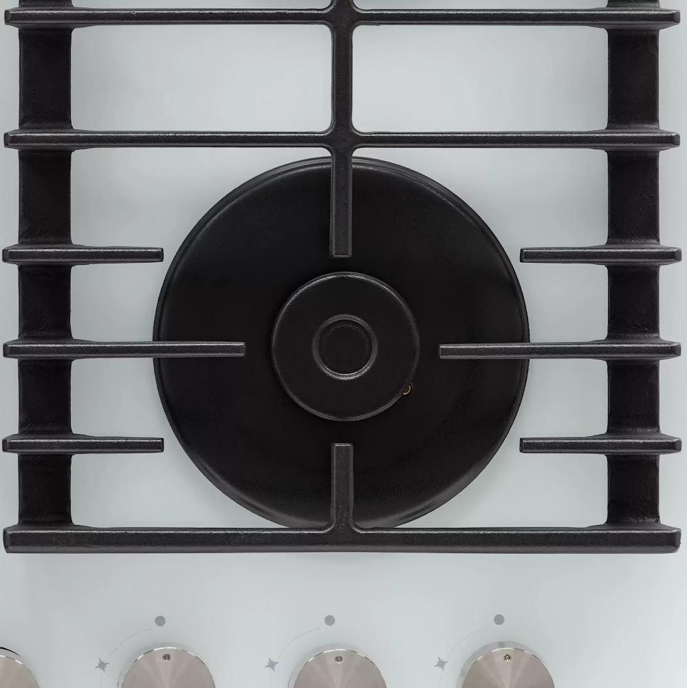 Выбор газовой варочной панели чаще всего обусловлен тем, что в частный дом или квартиру проведен именно газ в качестве обогрева. Работать с этой моделью довольно просто, так как мощность нагрева видна невооруженным взглядом — по силе огня в горелке. Количество конфорок в этой модели: 4.