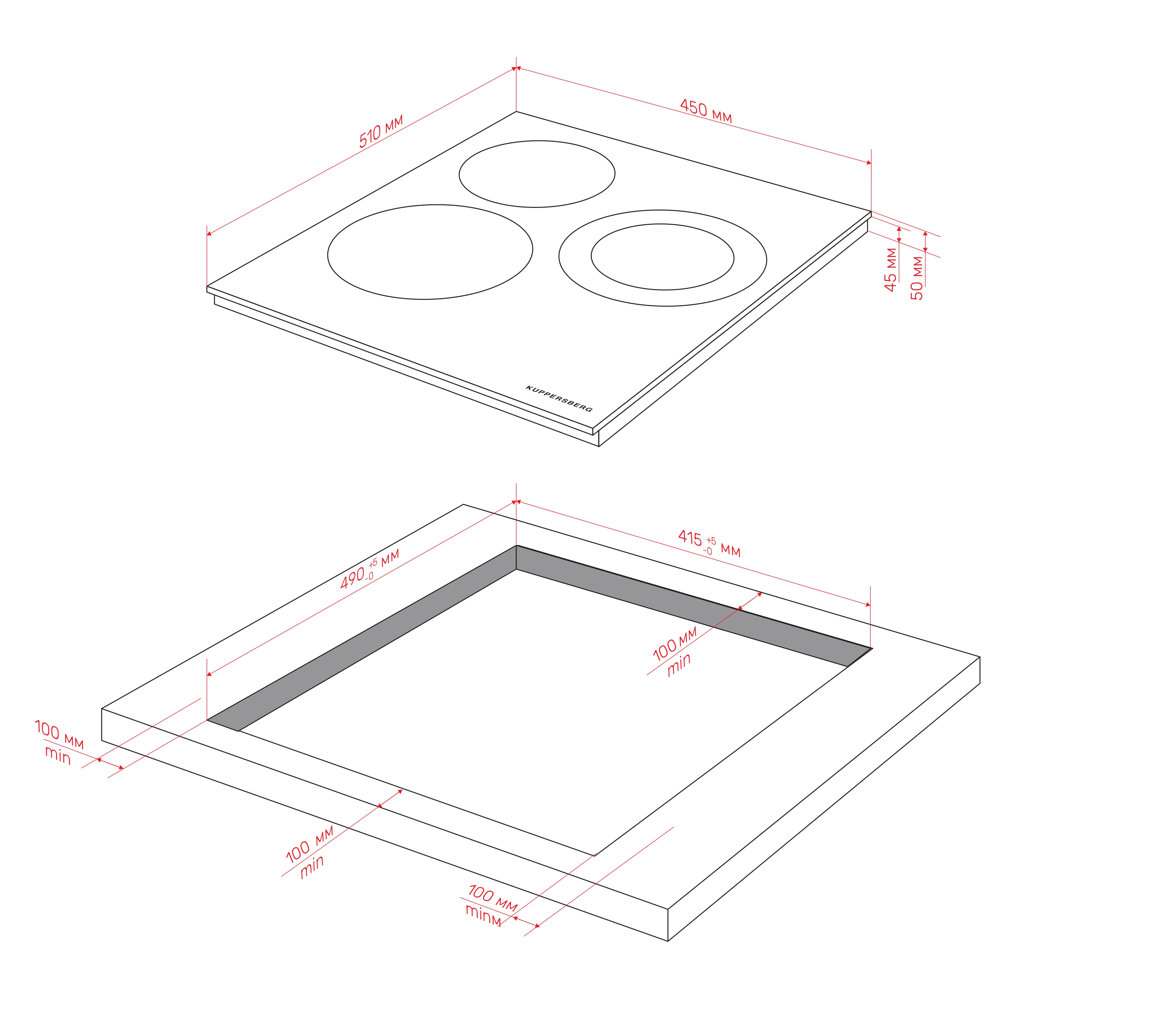 Электрические и индукционные варочные панели из стали, эмали и стеклокерамики имеют толщину от 4 до 5,5 cм, но выглядят более низкими, так как на них отсутствуют выступающие горелки. Как правило, подробные требования к толщине столешницы для установки приводятся в руководстве пользователя.