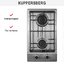 Две конфорки обладают разным диаметром, разной мощностью и позволяют приготовить широкий спектр блюд. Как и все варочные панели бренда Kuppersberg, модель оснащена системой газ-контроля. Специальный клапан, установленный в приборе, перекроет подачу газа если пламя в конфорке случайно погаснет. Таким образом, риск утечки газа полностью исключается. Благодаря электроподжигу пользоваться варочной панелью очень комфортно. Поворотные переключатели позволяют легко отрегулировать мощность пламени.