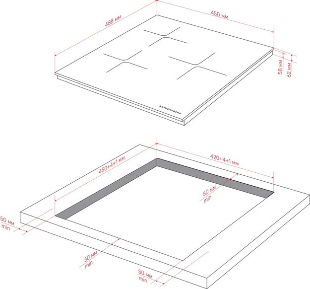 Электрические и индукционные варочные панели из стали, эмали и стеклокерамики имеют толщину от 4 до 5,5 cм, но выглядят более низкими, так как на них отсутствуют выступающие горелки. Как правило, подробные требования к толщине столешницы для установки приводятся в руководстве пользователя.