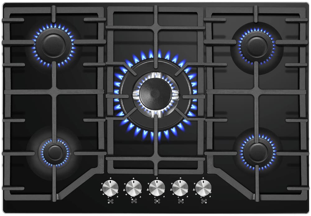 Выбор газовой варочной панели чаще всего обусловлен тем, что в частный дом или квартиру проведен именно газ в качестве обогрева. Работать с этой моделью довольно просто, так как мощность нагрева видна невооруженным взглядом — по силе огня в горелке. Количество конфорок в этой модели: 5.