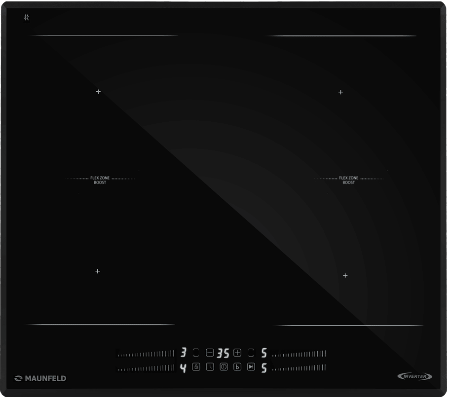 Варочная панель работает на индукционном нагреве — это значит, что повышается температура непосредственно посуды, в которой готовится блюдо. Таким образом промежуточная ступень с предварительным нагревом конфорки пропускается — сокращается время, повышается безопасность. Количество конфорок в этой модели: 4.