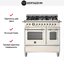 Устройства с тремя духовками также имеют один основной и две дополнительных шкафа разного объема: например, плиты Bertazzoni оснащены большой духовкой объемом 69 литров, средней объемом 54 литра и малой объемом 24 литра. Духовки располагаются в два ряда: две меньшие духовки в одном ряду, большая и ящик для посуды в другом.