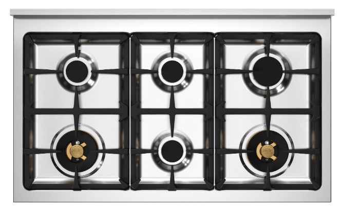 Устройства с тремя духовками также имеют один основной и две дополнительных шкафа разного объема: например, плиты Bertazzoni оснащены большой духовкой объемом 69 литров, средней объемом 54 литра и малой объемом 24 литра. Духовки располагаются в два ряда: две меньшие духовки в одном ряду, большая и ящик для посуды в другом.