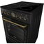 Устройства с тремя духовками также имеют один основной и две дополнительных шкафа разного объема: например, плиты Bertazzoni оснащены большой духовкой объемом 69 литров, средней объемом 54 литра и малой объемом 24 литра. Духовки располагаются в два ряда: две меньшие духовки в одном ряду, большая и ящик для посуды в другом.
