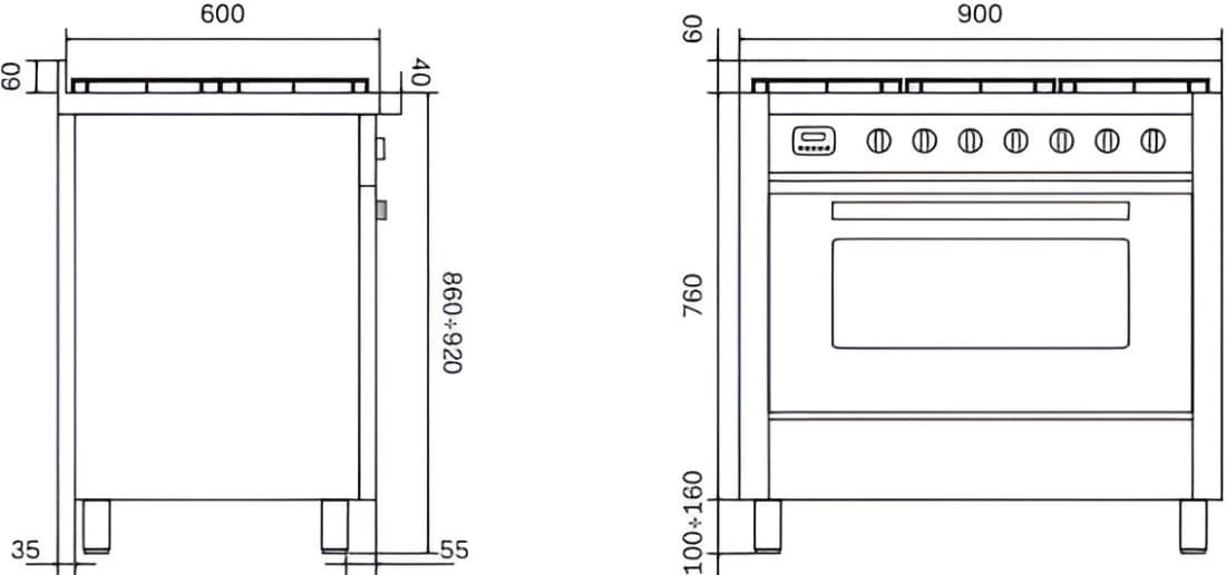 Ширина варочных центров — параметр, которых варьируется в самых больших пределах. Она зависит прежде всего от характеристик модели, в частности, от количества духовок. Производители предлагают модели минимальной шириной 59-60 см с одной духовкой. В магазинах также представлены модели с одной духовкой увеличенной ширины, которая достигает 90 см. Такую же ширину могут иметь варочные центры с двумя духовками, расположенными бок о бок. Модели Lofra с тремя духовками имеют ширину 120 см, а максимальная ширина около 196-200 см отличает модели Restart с дровяной печью и несколькими духовками.