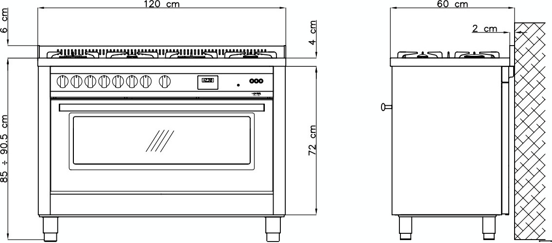 Ширина варочных центров — параметр, которых варьируется в самых больших пределах. Она зависит прежде всего от характеристик модели, в частности, от количества духовок. Производители предлагают модели минимальной шириной 59-60 см с одной духовкой. В магазинах также представлены модели с одной духовкой увеличенной ширины, которая достигает 90 см. Такую же ширину могут иметь варочные центры с двумя духовками, расположенными бок о бок. Модели Lofra с тремя духовками имеют ширину 120 см, а максимальная ширина около 196-200 см отличает модели Restart с дровяной печью и несколькими духовками.