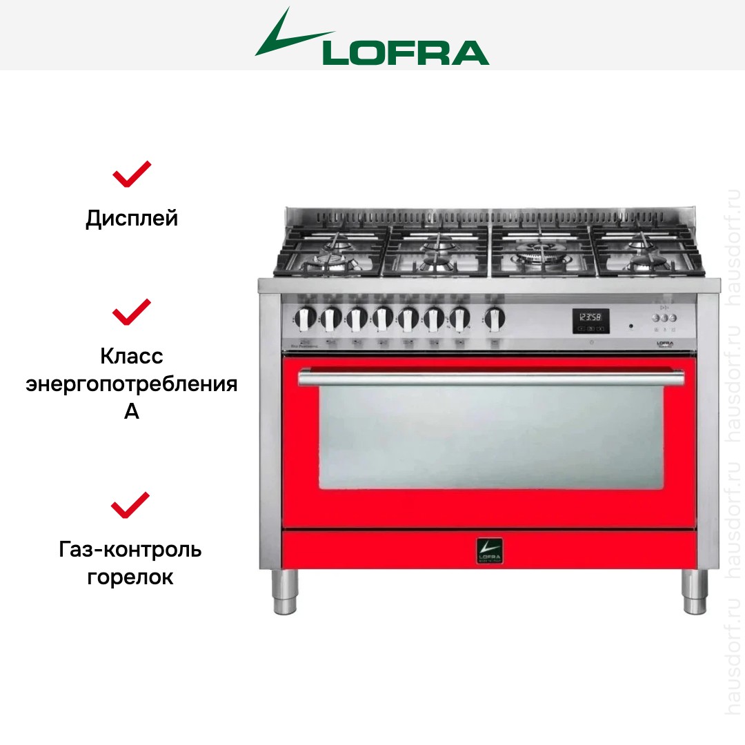 Газовая плита Lofra PRG126GVGT/2Ci — отличный выбор как для квартиры, так и для частного дома. Цвет корпуса красный, он гармонично сочетается с мебелью и техникой похожих оттенков, а также может интересно выглядеть на контрасте с ними. Для управления используется удобная и понятная электронная система. Благодаря ей выбирать режимы приготовления и настраивать параметры температуры очень просто. Основная информация о процессе отображается на дисплее. Переключатели не только выполняют техническую функцию, но и поддерживают общий дизайн; тип элементов: сенсорные + поворотные.