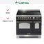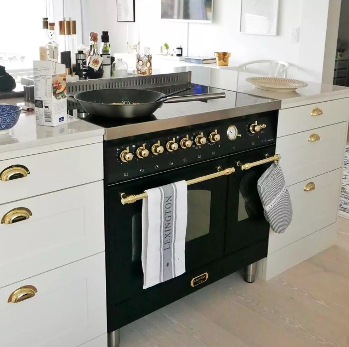 Устройства с тремя духовками также имеют один основной и две дополнительных шкафа разного объема: например, плиты Bertazzoni оснащены большой духовкой объемом 69 литров, средней объемом 54 литра и малой объемом 24 литра. Духовки располагаются в два ряда: две меньшие духовки в одном ряду, большая и ящик для посуды в другом.