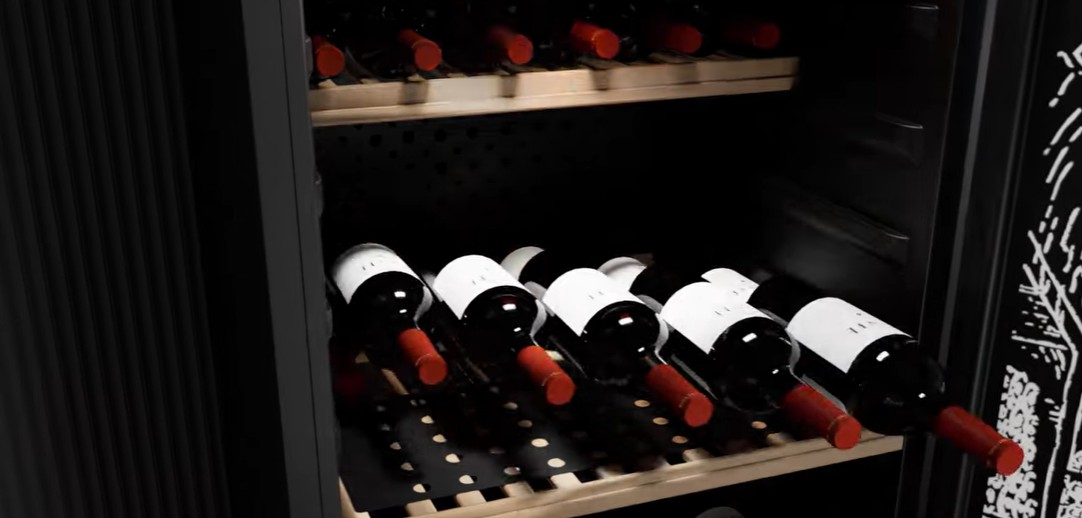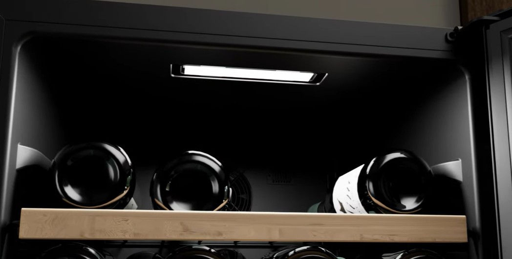 Внутреннее освещение винных шкафов полностью соответствует их основному назначению: бережному хранению коллекционных вин. Известно, что ультрафиолетовое излучение приостанавливает естественное брожение вина, что ухудшает его качество. В современных винных холодильниках используется только безопасное светодиодное освещение, как правило, синего цвета, которое к тому же практически не выделяет тепла и не влияет на качество охлаждения. Освещение часто дополняется функцией регулировки яркости — например, на демонстрационных полках, и может оставаться включенным долгое время.