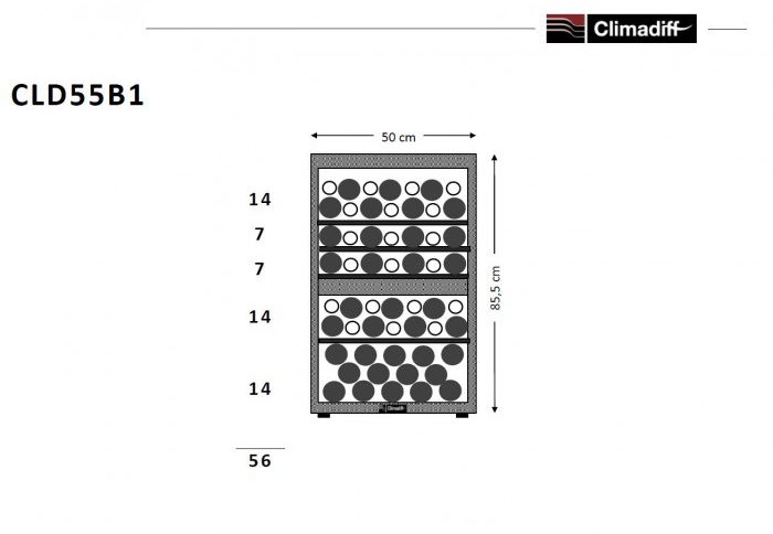 Винный холодильник Climadiff CLD55B1 имеет две температурные зоны, в которых одновременно можно хранить разные сорта алкоголя и выставлять разные сочетания настроек. Он устанавливается отдельно, что удобно, если у вас есть специальное помещение — кладовая, погреб и т.д. Благодаря компактным размерам данная модель — отличный выбор для офиса, гостиничного номера. Количество бутылок, которое можно разместить с учетом полной комплектации и из расчета объема бутылки 0,75 л, — 56 шт.