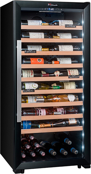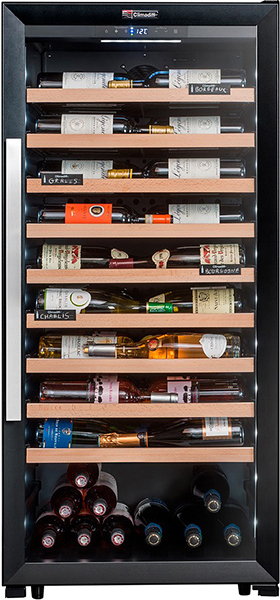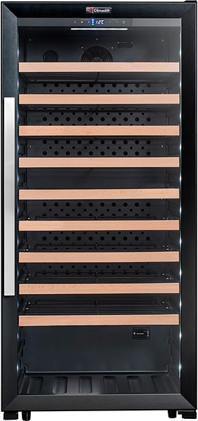 Винный холодильник Climadiff CPF100B1 имеет одну температурную зону, в которой можно разместить бутылки и единовременно выставить только одну комбинацию настроек. Он устанавливается отдельно, что удобно, если у вас есть специальное помещение — кладовая, погреб и т.д. Количество бутылок, которое можно разместить с учетом полной комплектации и из расчета объема бутылки 0,75 л, — 98 шт.