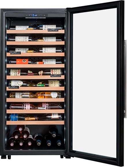Стеклянная дверь — дополнительный изящный штрих к общему дизайну модели. Специальное покрытие защищает вино от влияния ультрафиолетовых лучей, которые проникают, если шкаф находится в солнечной комнате. Цвет корпуса — черный.