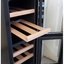 Полки в винных шкафах позволяют размещать бутылки для хранения в горизонтальном положении. Это необходимо, чтобы пробка постоянно смачивалась жидкостью и не пересыхала. Плотно закрытая пробка гарантирует, что внутрь бутылки не проникнет наружный воздух. Кислород, содержащийся в воздухе, может стать причиной ухудшения вкуса вина и даже его скисания. Кроме того, горизонтальное положение позволяет лучше оценить количество осадка. Материал изготовления полок выбирается, исходя из требований, предъявляемых к содержанию коллекции вин. Одним из основных требования является отсутствие или максимальное сокращение вибрации и хорошая фиксация бутылок на месте хранения. Даже если полка выдвигается, бутылки должны оставаться на своем месте. Второе требование исключает применение стеклянных полок, как в обычном холодильнике: на них почти невозможно зафиксировать бутылки.