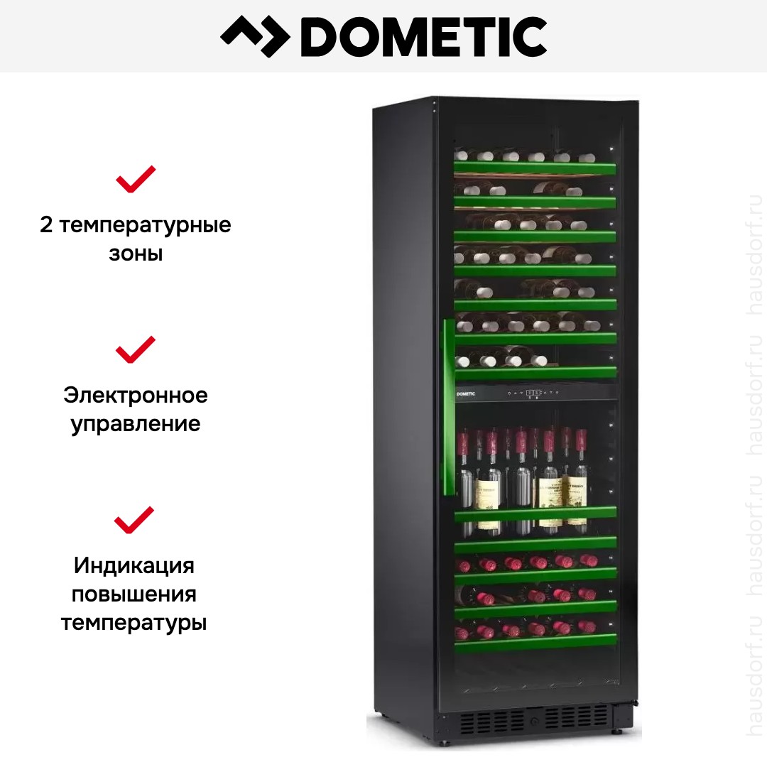 Винный холодильник Dometic E115FG Green имеет две температурные зоны, в которых одновременно можно хранить разные сорта алкоголя и выставлять разные сочетания настроек. Он устанавливается отдельно, что удобно, если у вас есть специальное помещение — кладовая, погреб и т.д. Количество бутылок, которое можно разместить с учетом полной комплектации и из расчета объема бутылки 0,75 л, — 115 шт.