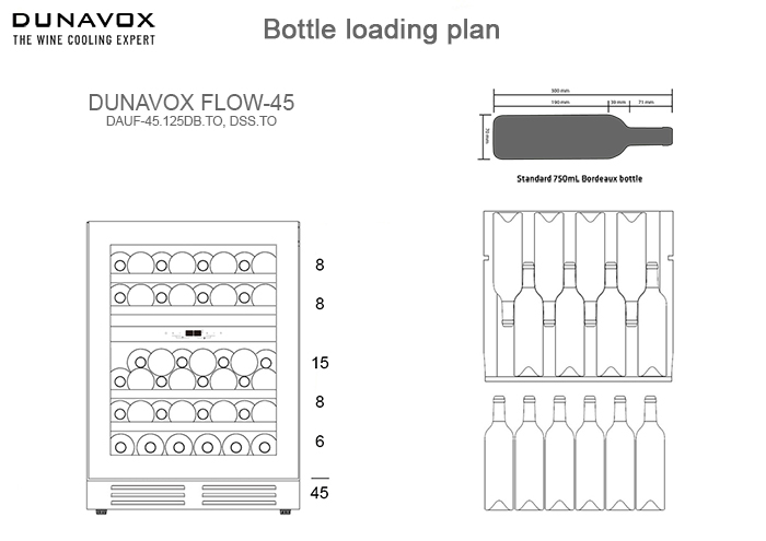 Стандартная вместительность рассчитывается по количеству бутылок «Бордо» 0,75 л. Это число также показывает максимальную загрузку при полной комплектации (полок, ящиков и других элементов).