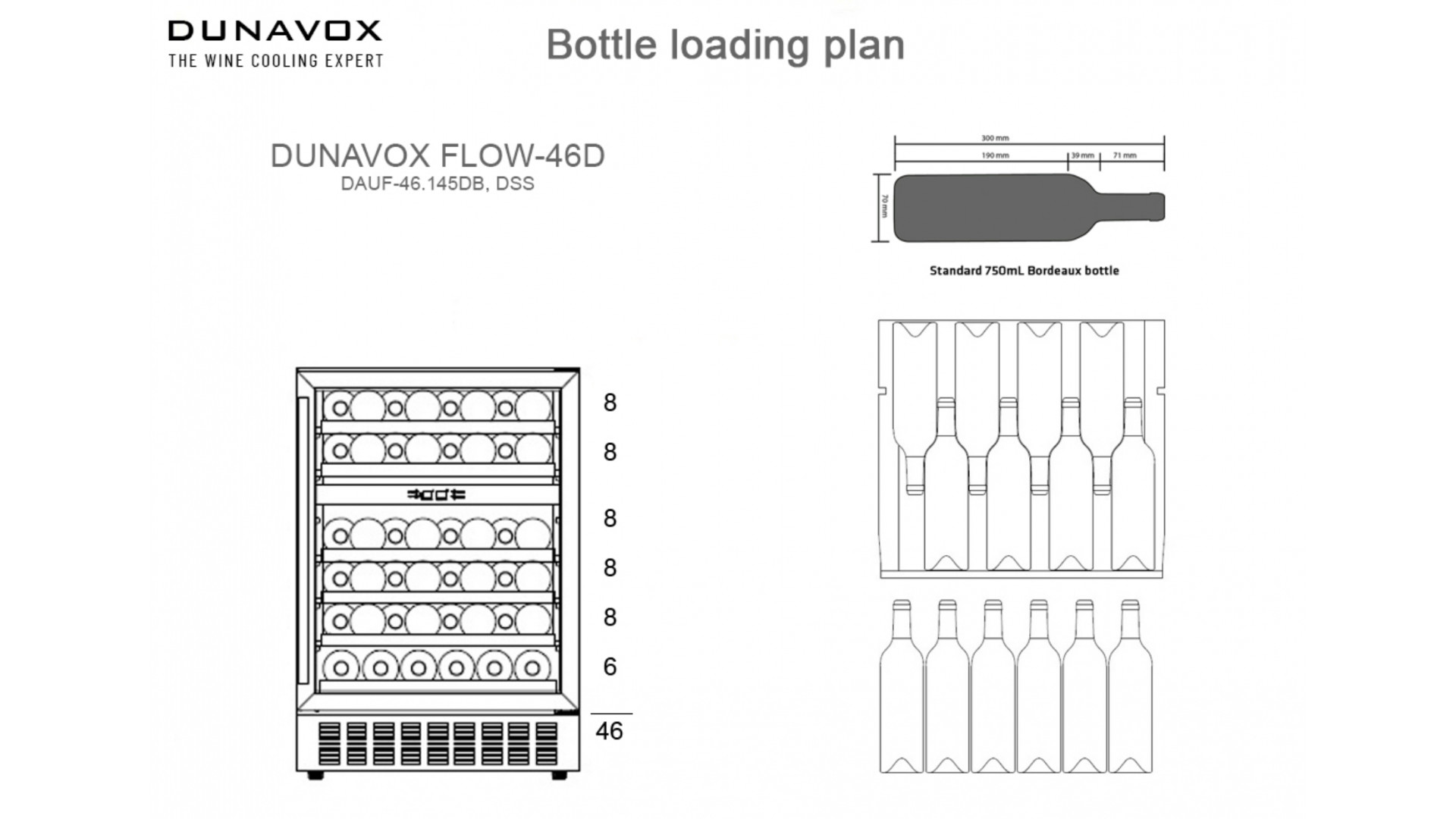 Стандартная вместительность рассчитывается по количеству бутылок «Бордо» 0,75 л. Это число также показывает максимальную загрузку при полной комплектации (полок, ящиков и других элементов).