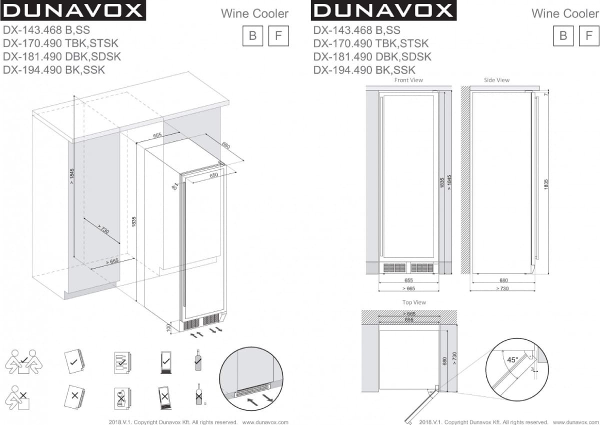 Винный холодильник Dunavox DX-194.490CK имеет одну температурную зону, в которой можно разместить бутылки и единовременно выставить только одну комбинацию настроек. Он устанавливается отдельно, что удобно, если у вас есть специальное помещение — кладовая, погреб и т.д. Количество бутылок, которое можно разместить с учетом полной комплектации и из расчета объема бутылки 0,75 л, — 194 шт.