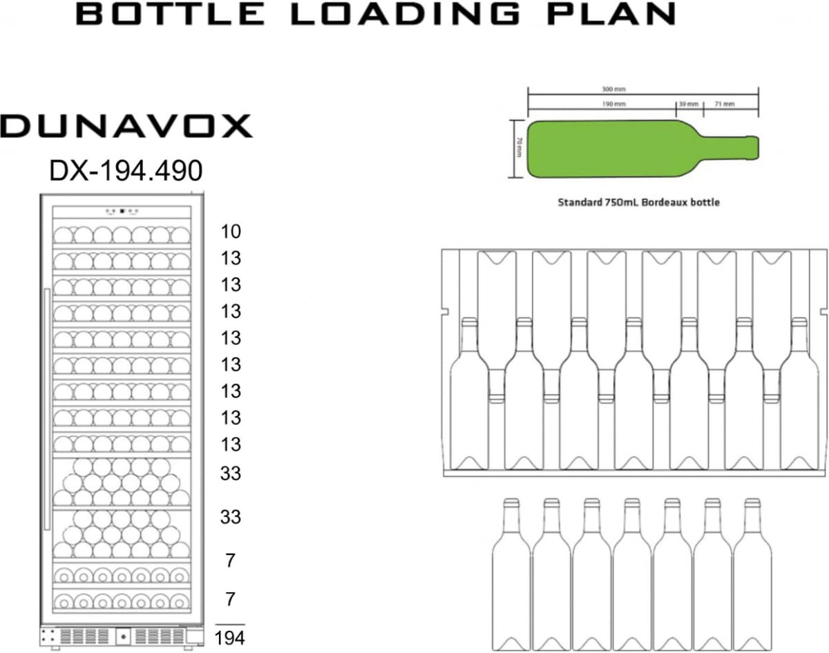 Винный холодильник Dunavox DX-194.490MBK имеет одну температурную зону, в которой можно разместить бутылки и единовременно выставить только одну комбинацию настроек. Он устанавливается отдельно, что удобно, если у вас есть специальное помещение — кладовая, погреб и т.д. Количество бутылок, которое можно разместить с учетом полной комплектации и из расчета объема бутылки 0,75 л, — 194 шт.