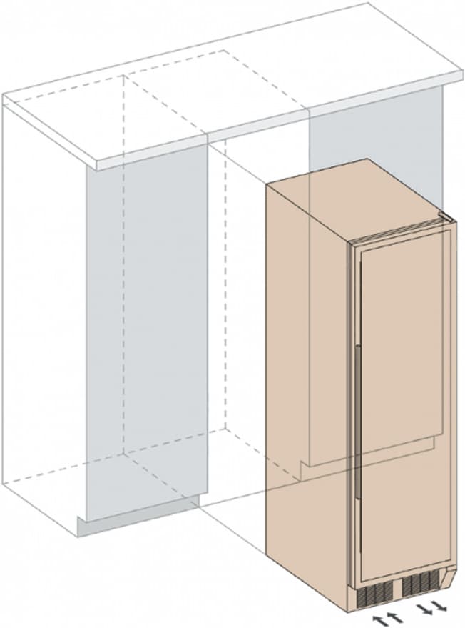 Некоторые отдельно стоящие винные шкафы, а также модели, встраиваемые в мебельную колонну, шкаф или другое закрытое пространство, оснащаются системой забора воздуха и вентиляционной решеткой, расположенными спереди в нижней части корпуса. Зазоры между корпусом шкафа и стенками мебели необходимы и в этом случае.