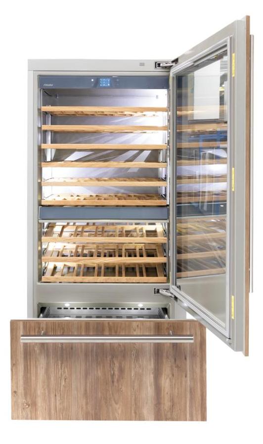 Винный холодильник Fhiaba S901TWT6 имеет несколько температурных зон, в которых одновременно можно хранить разные сорта алкоголя и выставлять разные сочетания настроек. Он встраивается в нишу, что удобно, если у вас ограничен метраж помещения. Количество бутылок, которое можно разместить с учетом полной комплектации и из расчета объема бутылки 0,75 л, — 108 шт.