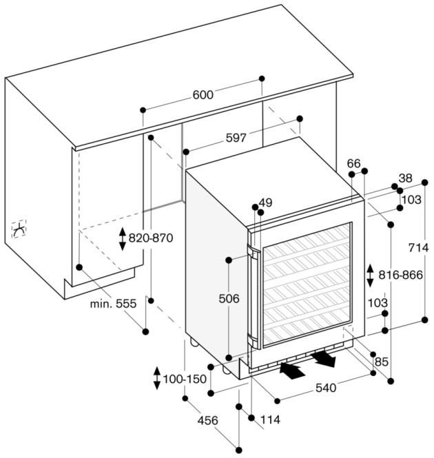 Некоторые отдельно стоящие винные шкафы, а также модели, встраиваемые в мебельную колонну, шкаф или другое закрытое пространство, оснащаются системой забора воздуха и вентиляционной решеткой, расположенными спереди в нижней части корпуса. Зазоры между корпусом шкафа и стенками мебели необходимы и в этом случае.
