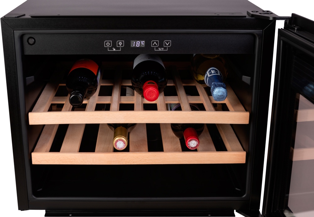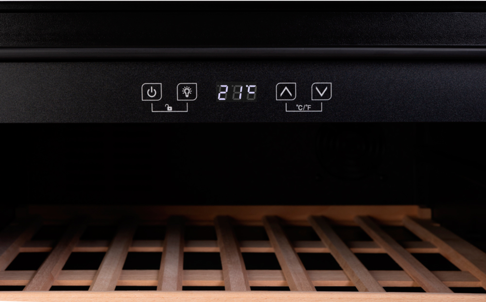Большинство современных винных шкафов имеет электронное управление, они могут оснащаться обычными цифровыми дисплеями, на которых будет отображаться минимум информации — о включении, температуре в камере и возникших неисправностях. Однако в большинстве моделей используются текстовые сенсорные дисплеи из нескольких сегментов. С помощью кнопок сенсорного меню на этих дисплеях можно отображать и регулировать температуру в каждой зоне отдельно с точностью до градуса, выбирать уровень влажности, задавать дополнительные опции — отключение сигнализации, включение вентиляции и внутреннего освещения, активацию защиты от детей, тип отображения температуры ºF/ºC. Здесь же будут появляться коды ошибок, выданные системой обнаружения неисправностей.