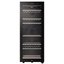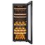 Стеклянная дверь — дополнительный изящный штрих к общему дизайну модели. Специальное покрытие защищает вино от влияния ультрафиолетовых лучей, которые проникают, если шкаф находится в солнечной комнате. Цвет корпуса — черный. Дверь можно перевесить на другую сторону, поэтому вариантов размещения его в доме становится больше.